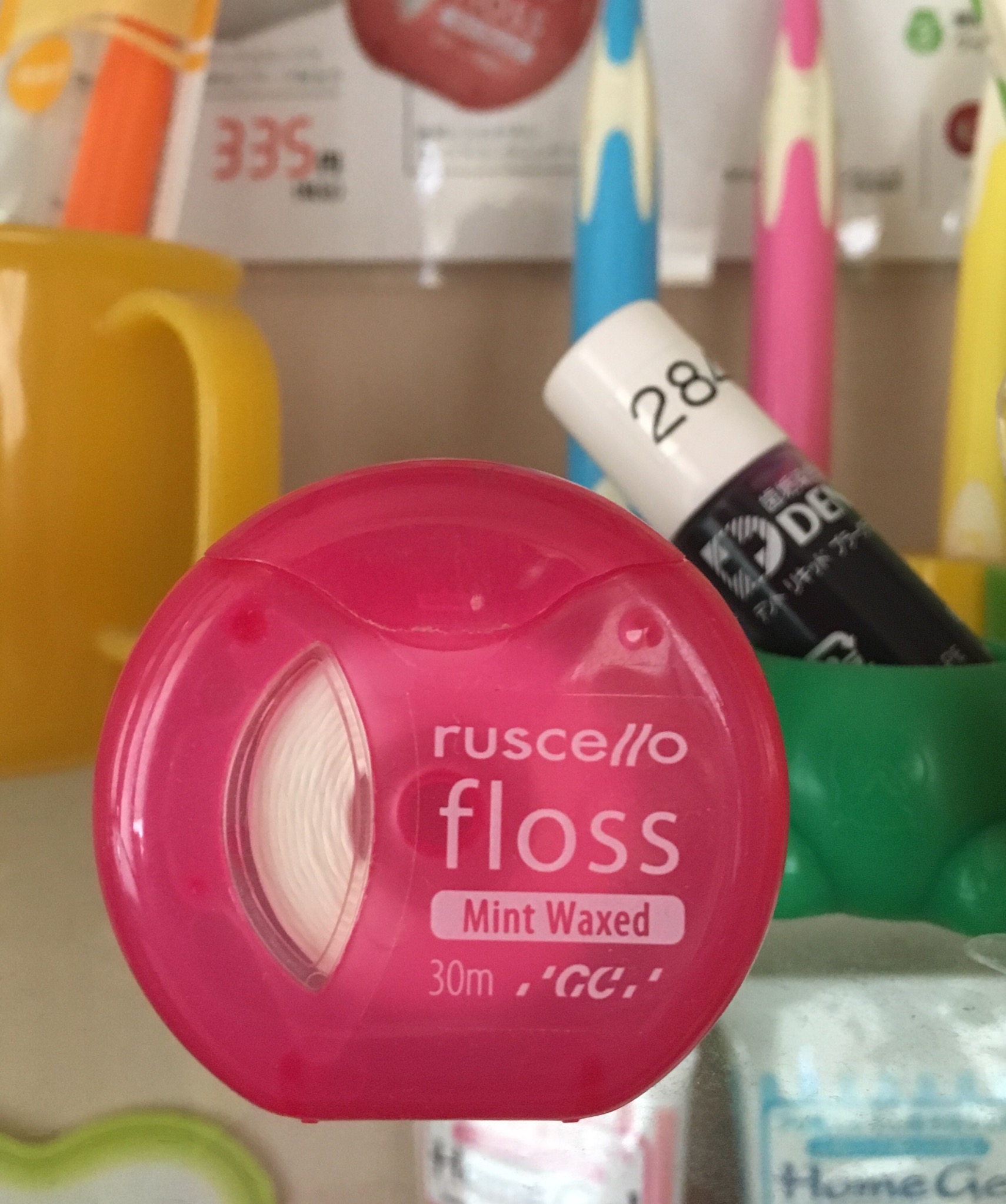 ruscelloのフロスは歯ブラシ同様、ケースの色が可愛いのもオススメポイントです!ワックス無しタイプはホワイトのみですが、ワックスありのタイプはピンク、イエロー、パープル、グリーン(当院ではパープルは置いてないのですが、、)の4色というバリエーション。毎日使うのも楽しくなります!