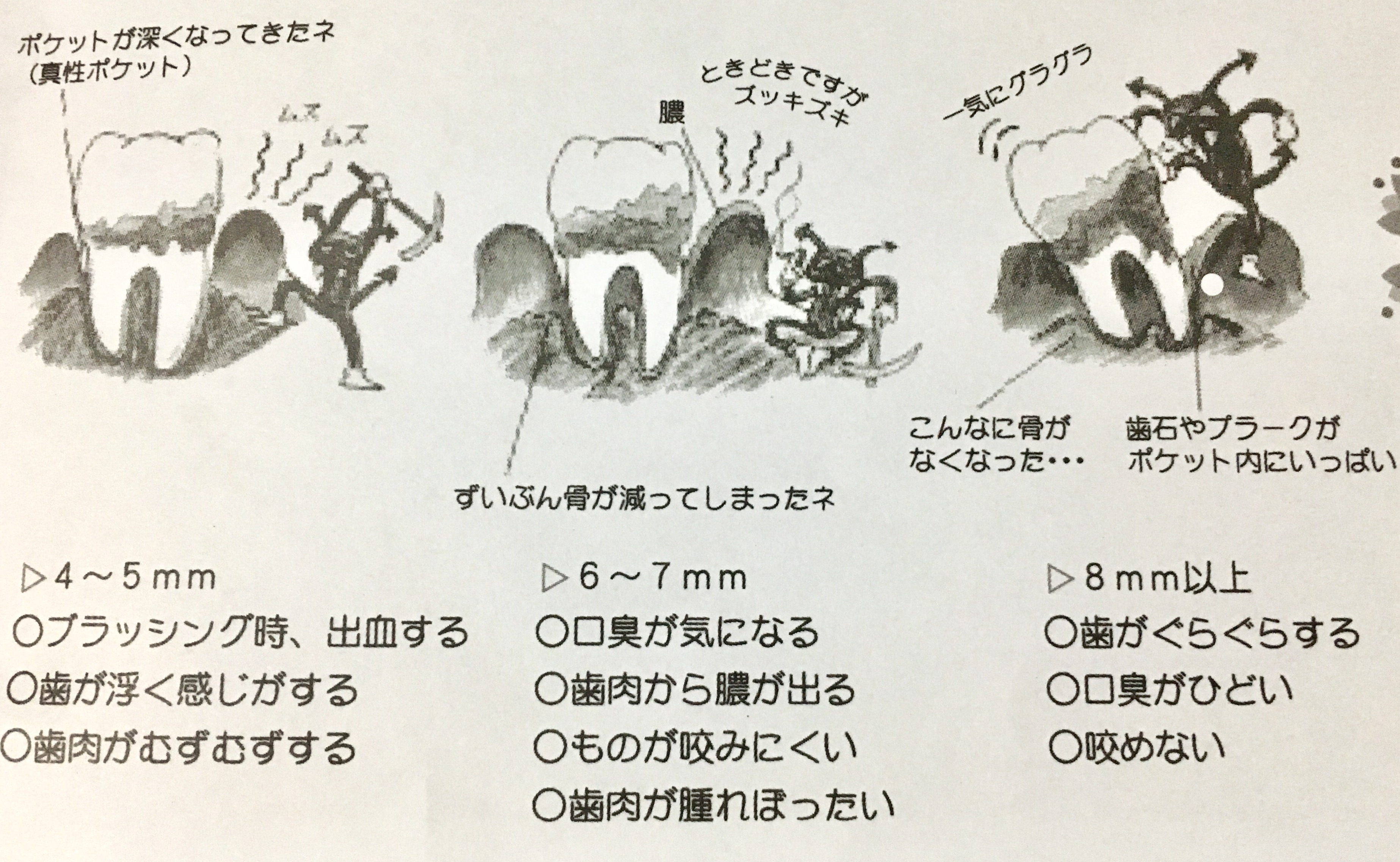 歯がぐらぐらする。口臭がひどい。かめない。歯肉が腫れて痛むなどの症状がでます。