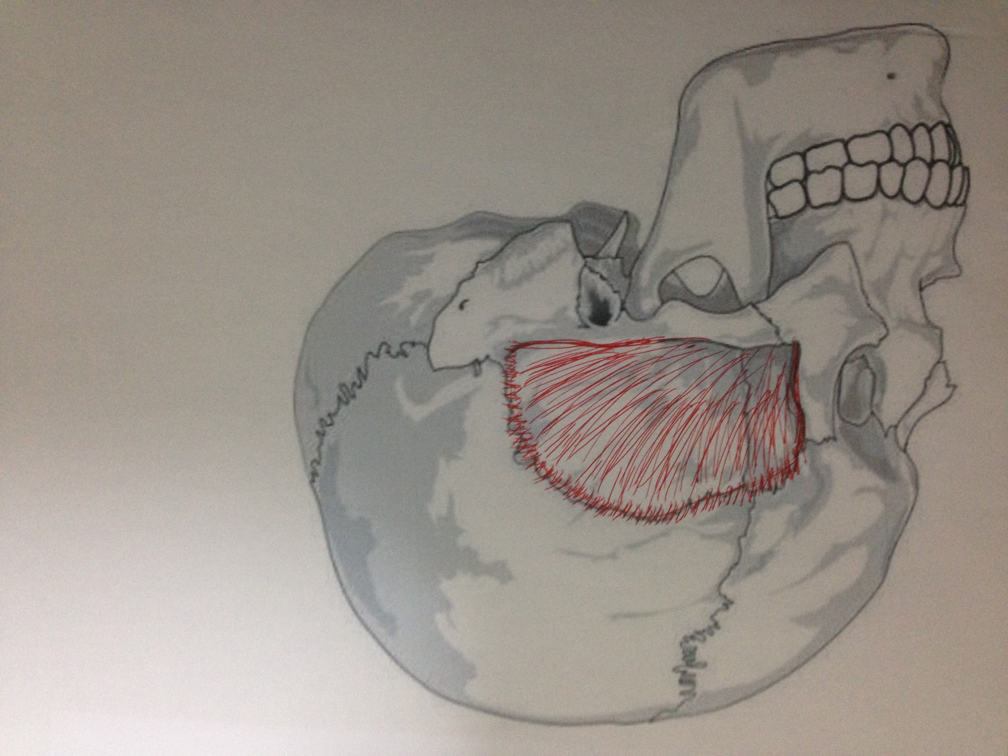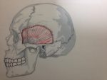 側頭筋は頭の横に広がる筋肉で、咀嚼筋の中で1番大きな筋肉です。こめかみを触って咬み込むと、側頭筋が動くのが分かると思います。側頭筋は顎関節の後上方に位置するため、口を閉じる働きとともに顎を後方に引く働きを担います。