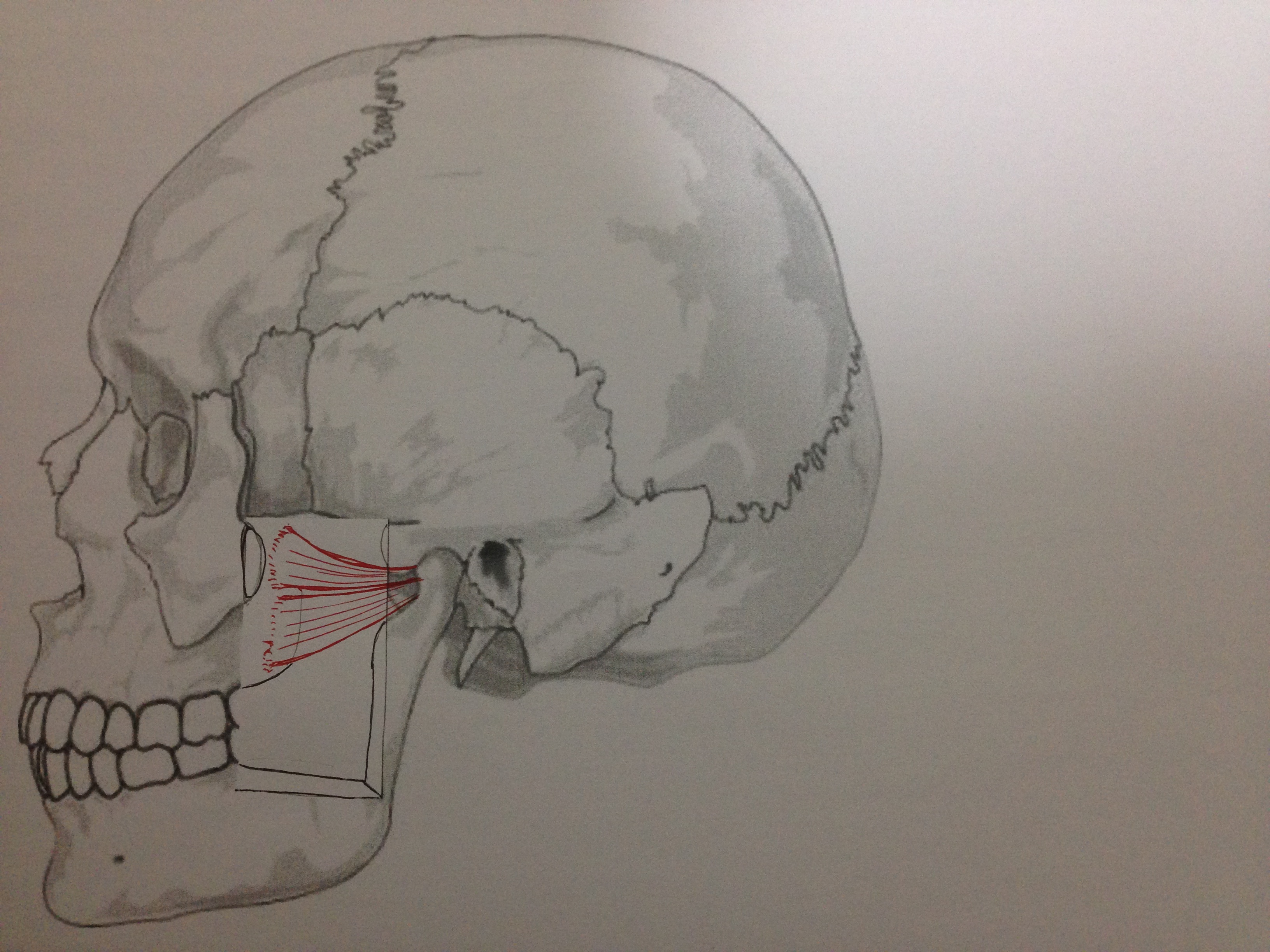咬筋は、咀嚼筋の中で最も咬合力を発揮する筋肉です。単純に口を閉じる動きをします。咬み込んだ時に顎の外側を触ると咬筋が盛り上がるのが容易に分かるはずです。また、咬筋は、下顎骨の発達にも関与し、咬筋が発達している人は顎もしっかりした四角い顔の人が多いです。