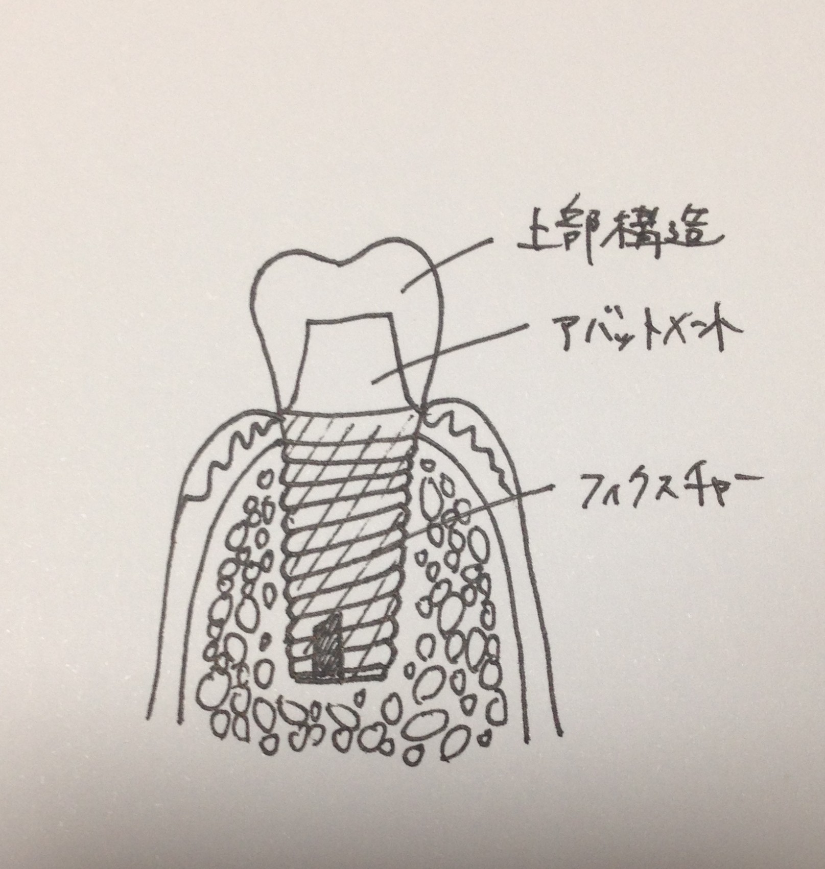 インプラントの構造は、フィクスチャー、アバットメント、上部構造の3つから構成されます。