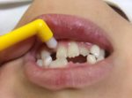 生えはじめの歯は、他の歯よりも背が低く一段下がっていますので、先ほどのワンタフトブラシや、歯ブラシを真横(口角の方)から挿入して磨いてあげると毛先がしっかり届きやすくなります。