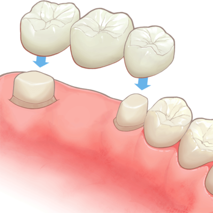 ブリッジは抜いた歯の両隣の歯があれば治療可能です。隣の歯を小さく削って繋がった被せ物をして抜いた歯の所にダミーの歯を入れます。両隣の歯で真ん中を支える感じです。イメージしずらいと思うので絵をみてみて下さい!