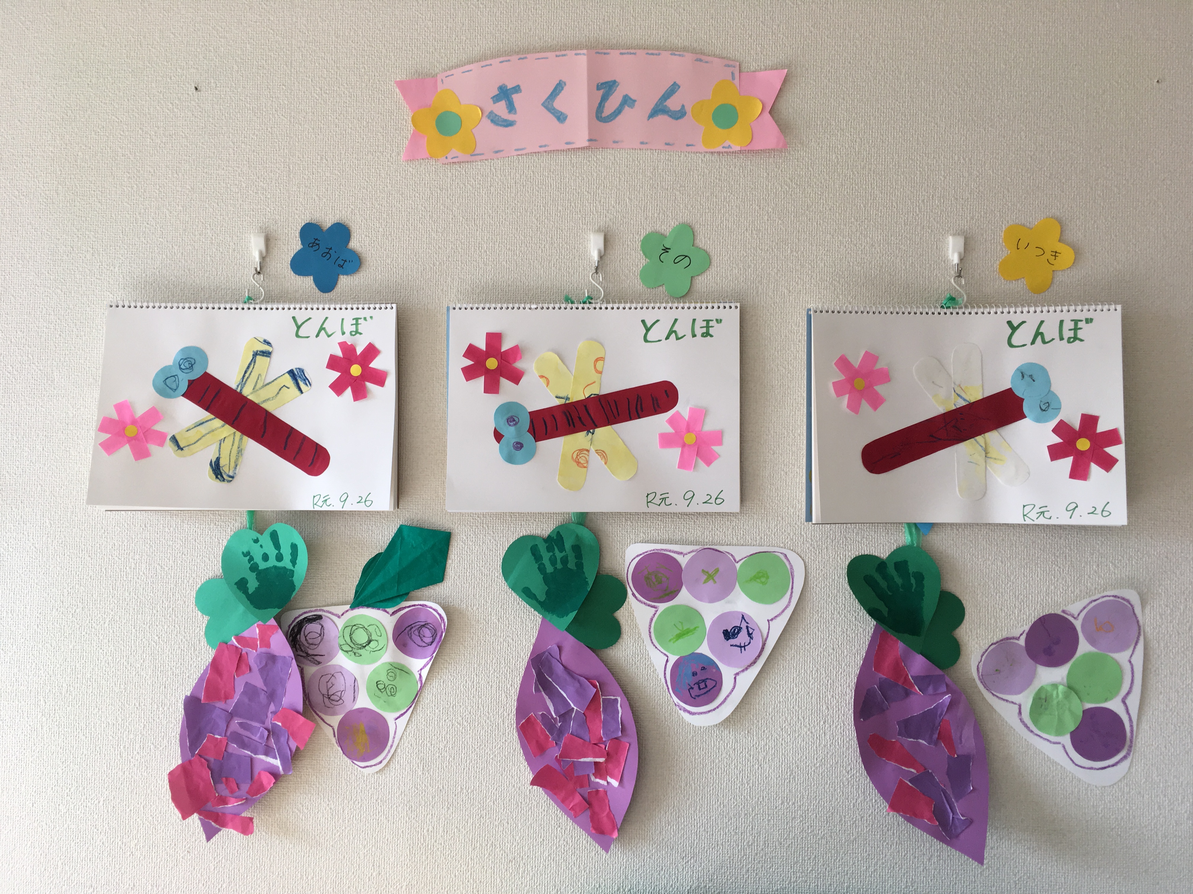 10月の製作はトンボとぶどうお芋を作って飾りました!