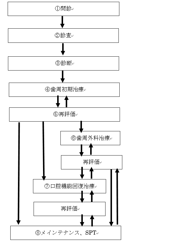以上が、基本的な歯周病治療の流れです。軽度の歯周病では簡単な歯周初期治療の後、スキップしてメインテナンス・SPTに移行し、重度な歯周病では歯周外科治療や口腔機能回復治療などの様々な治療を行っていく必要があります。