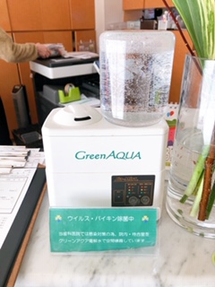 当院で空間噴霧しているこのグリーンアクアとは、低濃度の食塩水を電気分解した、環境にやさしい除菌・消臭機能水(微アルカリ高濃度電解次亜塩素酸水)です。