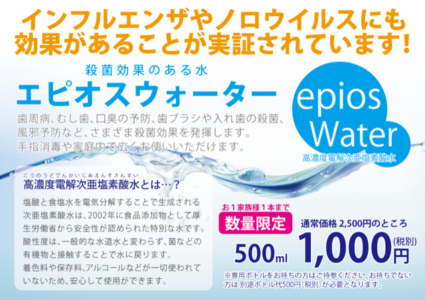 エピオスウォーターとは、殺菌効果のある水で、歯周病・虫歯・口臭の予防・歯ブラシや入れ歯の殺菌・風邪の予防などさまざまな殺菌効果を発揮します。手指消毒や家庭内で広く使えるのでおすすめです。