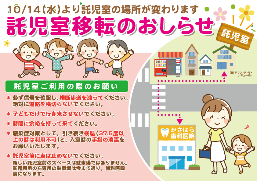 託児室前に車は止めないでください。新しい託児室前のスペースは駐車場ではありません。託児利用の方専用の駐車場は今まで通り、歯科医院裏になります。