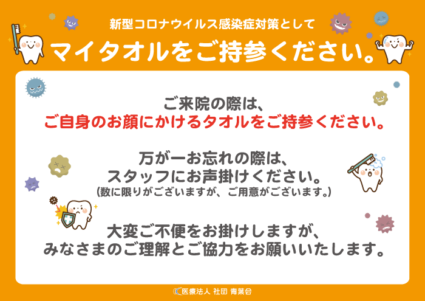 そこでみなさんにご自身のお顔にかける「マイタオル」のご持参をお願いしております。