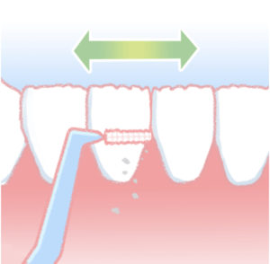 これは歯間ブラシの一般的な使い方です。ブラシの先を歯と歯の間の歯茎(歯間乳頭)に合わせて、やや上向きに入れるとスムーズに入ります。歯の面に沿わせて左右に動かすことで、歯のカーブまでしっかり清掃することができます。また、裏側からも同じように入れるとより効果的です。