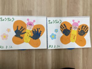 ちょうちょは自分たちの手を絵の具で塗ってぺたっとして模様をつけたらかんせーい!!!