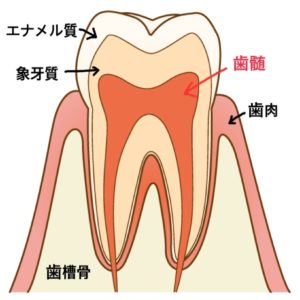 歯の一番内側にある赤い部分は「歯髄(しずい)」といいます。