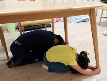 そしてシェイクアウト訓練後はプラスアルファの訓練(家具等の転倒防止確認、非常持ち出し品や備蓄物資の確認など)家具等の転倒防止対策の確認、非常持ち出し品や備蓄物資の確認、ご家庭や地域などにおける連絡方法の確認などを併せて確認しましょう。