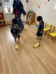 おやつを食べた後は、焼き芋🍠・チョコバナナ🍌・わたあめ・焼きそば・手作りおもちゃを買います。自分達で作ったお財布からお金を取り出し、「これくださ〜い!」「100円です!おつりどうぞ〜」などと会話も楽しみながら買い物ごっこをしました。