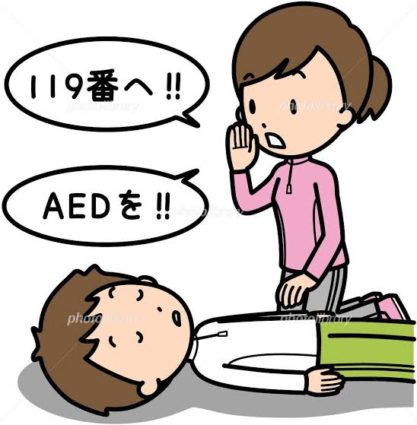 周りに人がいればここでAEDを持ってくることと119番通報をそれぞれ、呼びかけましょう。
