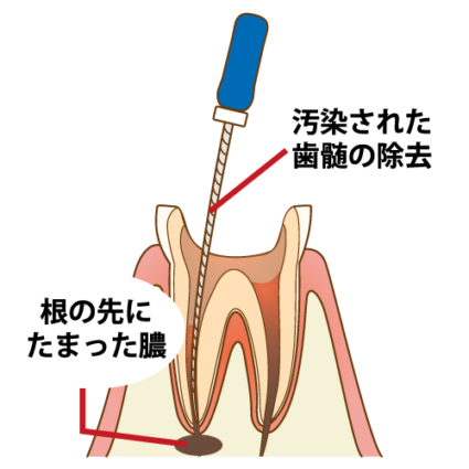根管治療中は、むし歯菌が感染した神経や腐敗物などの感染源をきれいに取り除くためにリーマーという器具を使って、根管内を内部から拡大清掃し、きれいになった根管内をガッタパーチャなどの根充材(根管内を埋める薬)で封鎖していくことが根の治療です。