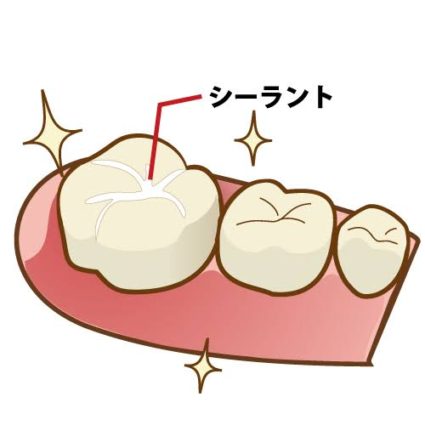 シーラントとは、むし歯の予防処置のことです。歯には溝があり、溝の部分は歯ブラシが当たりにくい部分で食べかすや汚れがたまりやすい場所です。その溝の部分をプラスチックの材料で埋めることで、汚れがたまりにくくなり、むし歯になるのを防ぎます。