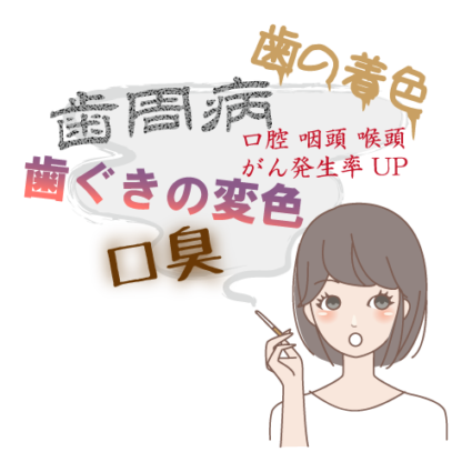 タバコを吸われる方は、お口が臭い・ヤニがつく、歯周病(歯槽膿漏)にかかりやすく、ひどくなりやすいので、治療しても治りにくいことが解っています。