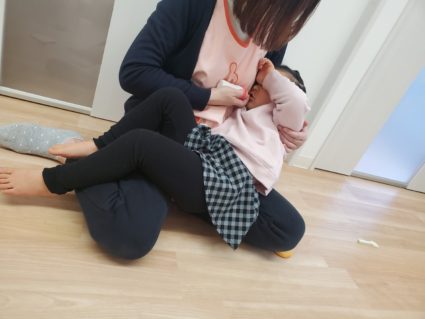 ②歯磨きをしてあげるときには、子どもをまっすぐに寝かせます。(あぐらを組んだところに頭を置いてあげると安定します)