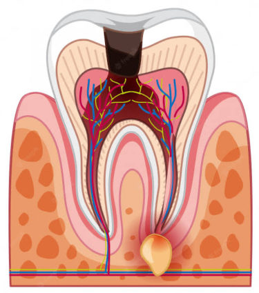 Suppose the nerve is dead and the treatment inside the root is not done or is incomplete. In that case, the inside of the root canal becomes infected with bacteria, and the root tip becomes pus-filled (When bacteria and dead pulp tissue develop, pus-filled pockets generate a dental abscess). In this case, the infected root canal is properly cleaned or decayed matter, etc., and the inside of the root canal is filled with a material known as gutta-percha medicine.