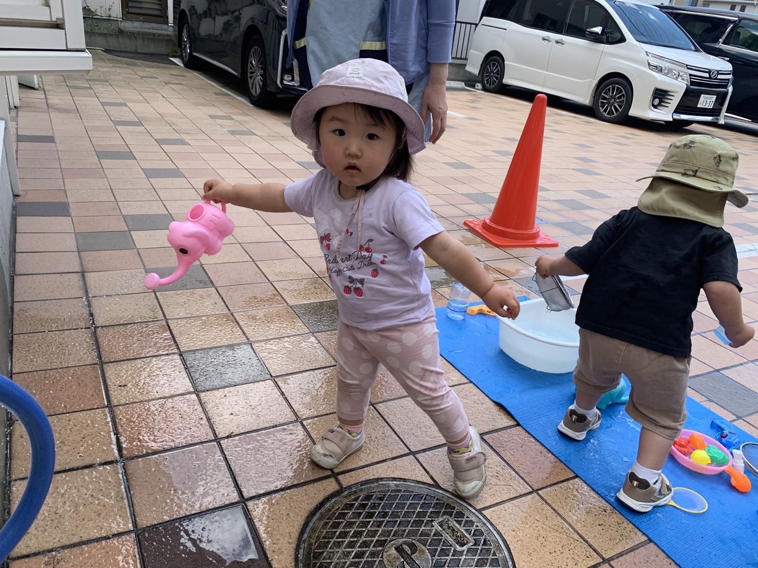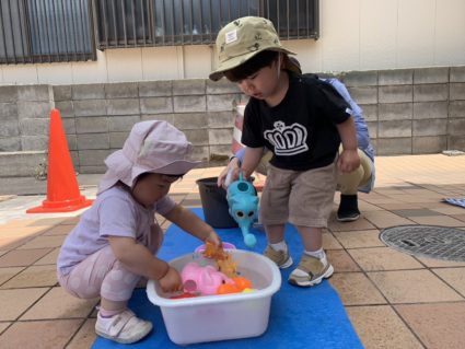 そして今週は夏のような暑さになり託児室前のスペースで今年度初の水遊びをしました☀️