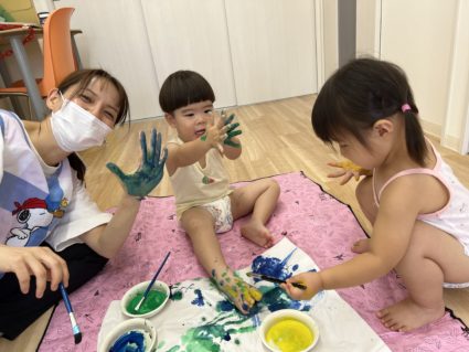 暑い日はお部屋で大胆に絵の具遊び🎨絵の具の感触をいっぱい感じて楽しかった(^_^)終わりのシャワーも気持ち良かった〜🚿