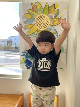 みんなで描いて貼って作った大きいひまわりの前でハイポーズ(^o^)