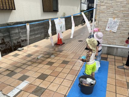お外では的当ての水遊び🎶新聞や風船めがけてお水をそれ〜〜〜