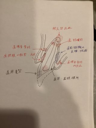 歯根膜の一部に断裂があり、歯肉溝からの出血を伴う場合もあります。