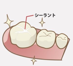 シーラントとは、虫歯になりやすいとされている歯の溝の部分は複雑な形をしているためをレジンの材料で歯を削らずに歯の溝を埋める処置の事を言います。