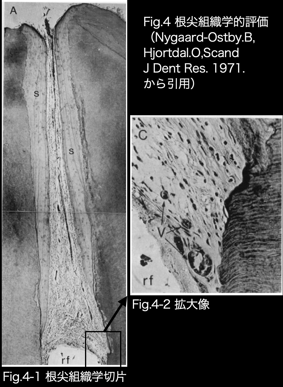 Revascularizationの治療法が確立したのは2010年頃と臨床的に見れば近代的な治療法になりますが、実は1960年代にNygaard-Østbyにより歯髄再生の概念が提唱されました。Nygaard-Østbyは抜歯窩など他の組織の治癒と同様に損傷した歯髄の治癒の第一段階は血餅形成であると仮説を立て実験を行いました。生活歯と歯髄壊死の歯に対して根管および根尖孔の拡大形成、根管貼薬を行ったあと、根尖孔外から根管内へ出血を促し、形成された血餅よりもやや歯冠側の位置までKloroperka N-O糊材とガッタパーチャポイントを用いて根管充填を行いました。その後、治療した歯は後日抜歯され組織学的評価を行うと、血管および結合組織の根管内での増殖(Fig.4-2)が生活歯で80%、失活歯で8%、根管壁にセメント質様硬組織の形成(Fig.4-1)が認められました。歯髄は線維芽細胞を豊富に伴う結合組織であるため、根管内に線維性結合組織が形成されたことは望ましいことですが、本来根管内に認められないはずのセメント芽細胞が観察されたり本来根管内に認められるべき象牙芽細胞が観察できなかったりと組織学的には歯髄再生と言えるものではありませんでした。しかしながら、Nygaard-Østbyの研究は、後に米国歯内療法学会(AAE:American Association of Endodontists)にて作られた”Revascularization”のプロトコルの元になった実験であると言えます(※1)。