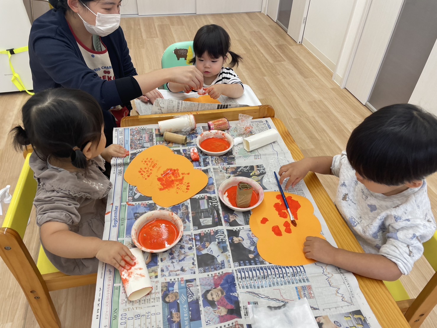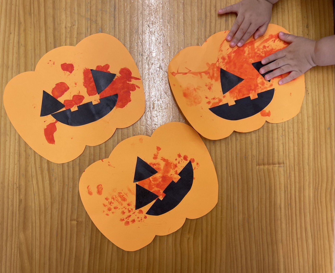 絵の具で塗り塗りした後目と口を思い思いにぺたぺた!愛らしいジャック・オー・ランタンができました🎃