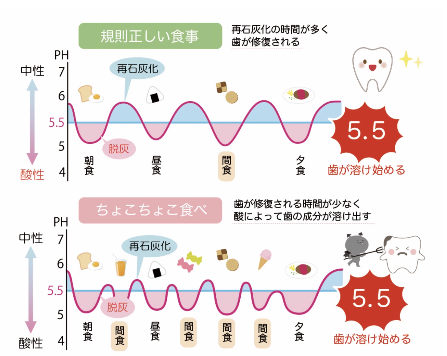 食事をすると、お口の中のpH(酸性度)は数分で「pH 5.5」以下まで一気に下がります。この5.5という数字が運命の分かれ道。これより酸性になると、歯のエナメル質が溶け始めてしまいます(これを【臨界pH】と呼びます)。