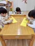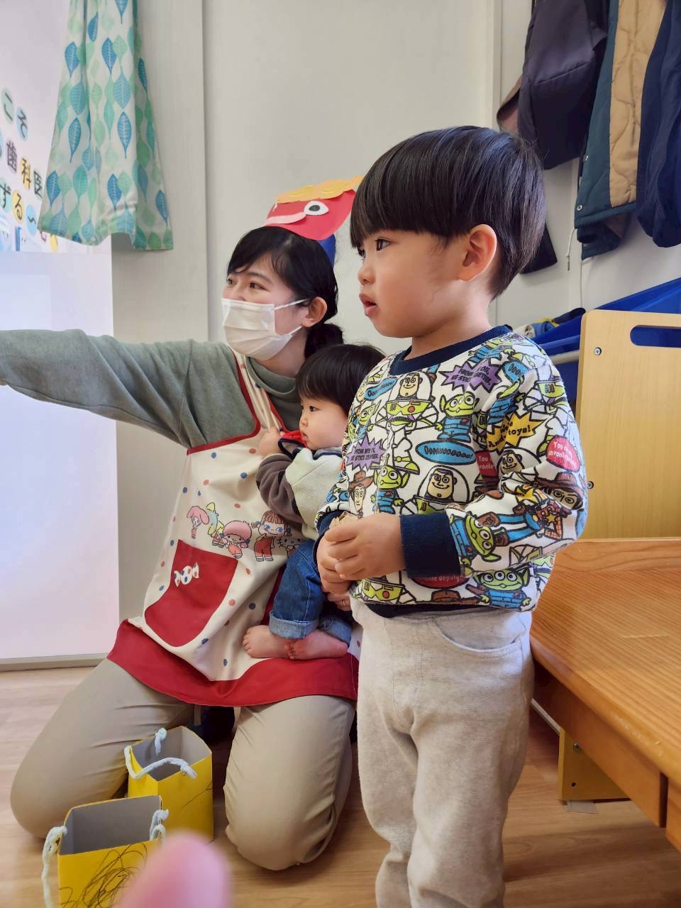 2月3日は節分の日でした。託児室の子どもたちで、『鬼のお面』や『豆入れ』を作って、当日は豆まきをしました!